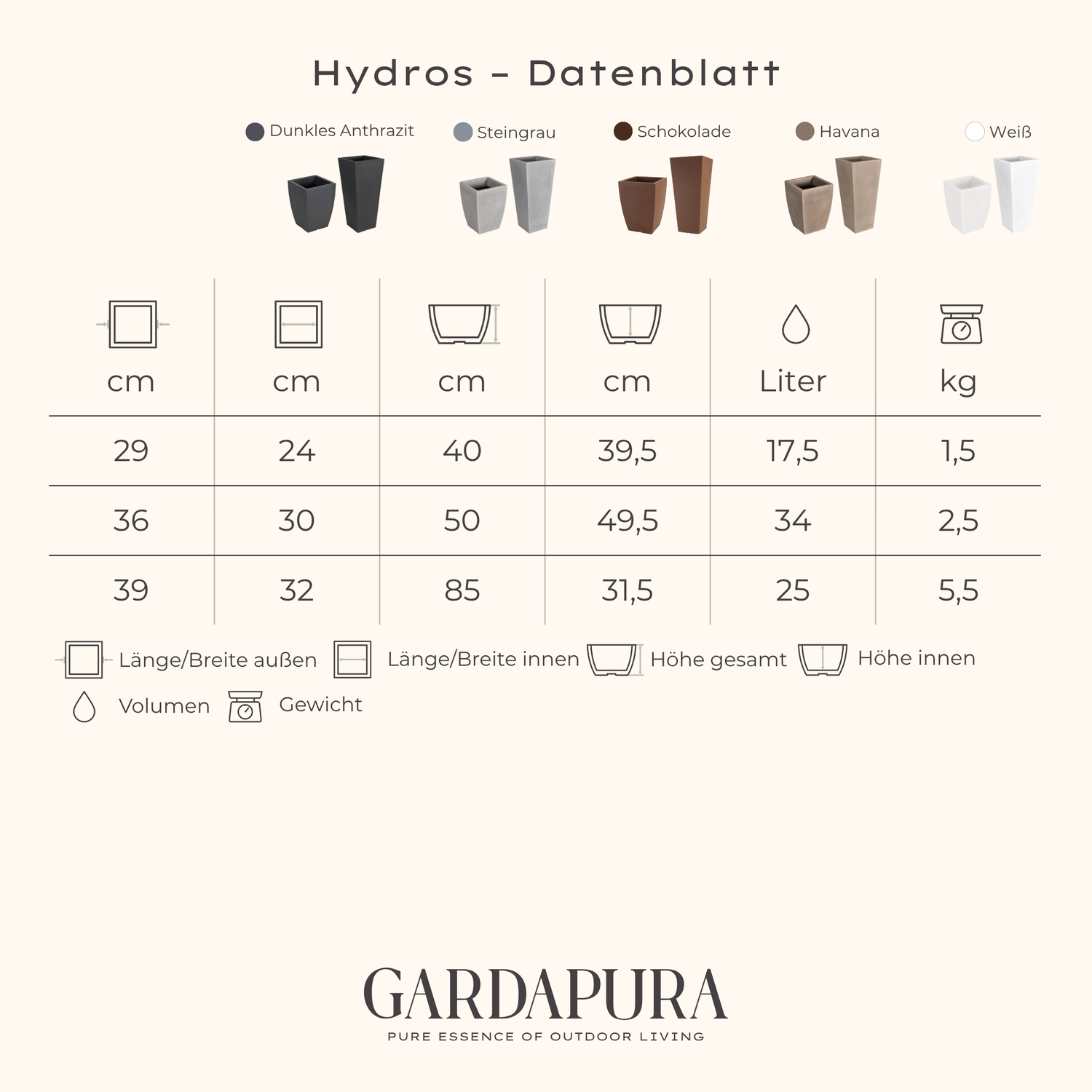 Erhältlich in einer Auswahl zeitloser Farben, integriert sich der eckige Pflanzkübel Hydros mühelos in jedes Ambiente und verleiht Ihren Pflanzen einen modernen und stilvollen Rahmen. Entscheiden Sie sich für Hydros und bringen Sie klare Linien in Ihr grünes Paradies!