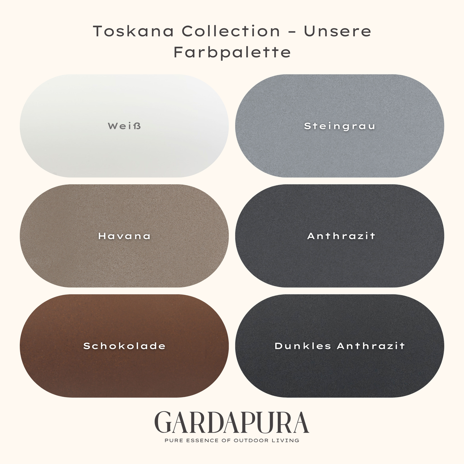 Der Topf Hydros ist in Dunklem Anthrazit, Schokolade, Havana, Steingrau und Weiß erhältlich und passt farblich so zu den anderen Modellen der Toskana Collection.