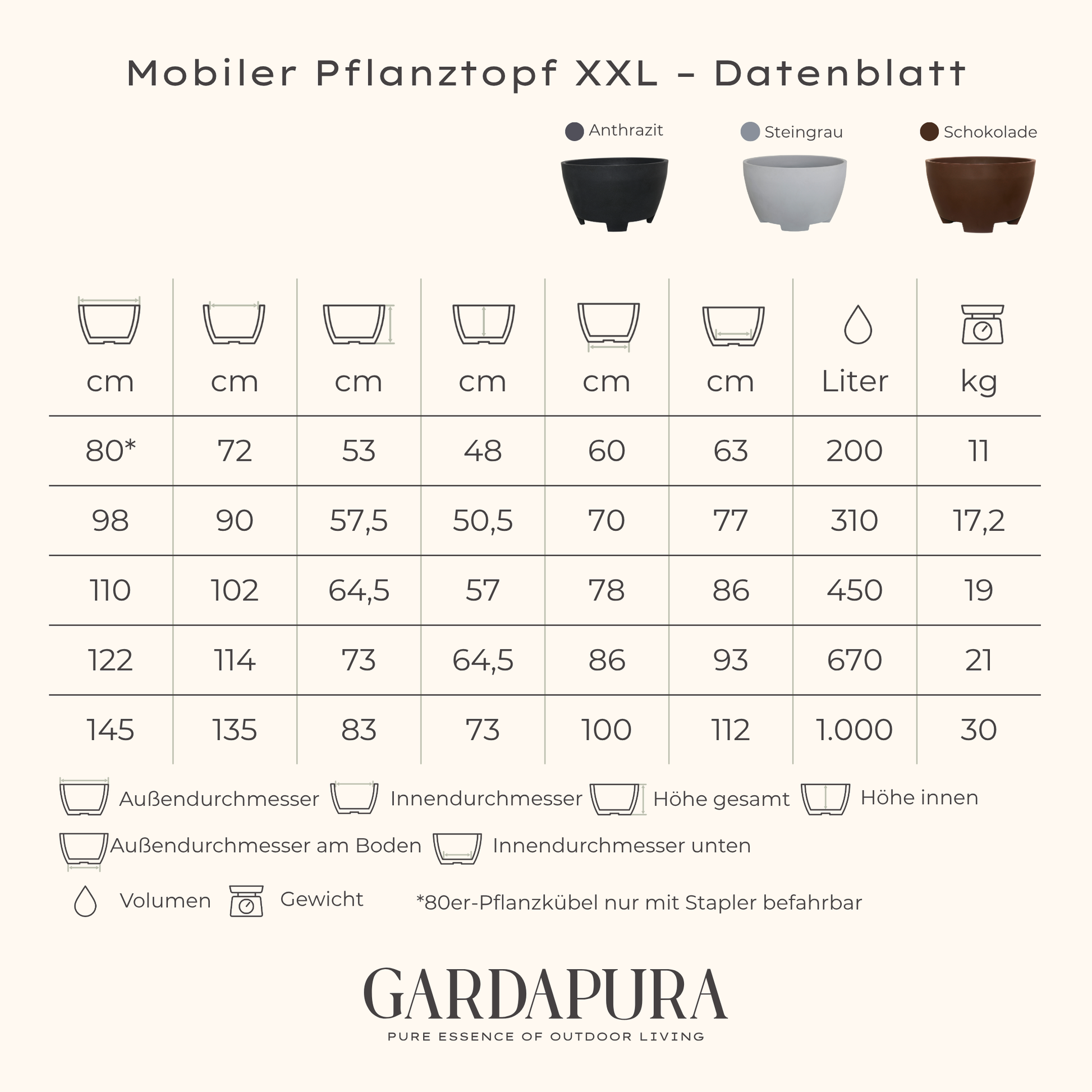 Der Mobile Pflanztopf XXL ist in Anthrazit, Steingrau und Schokolade erhältlich und passt farblich so zu den anderen Modellen der Toskana Collection.