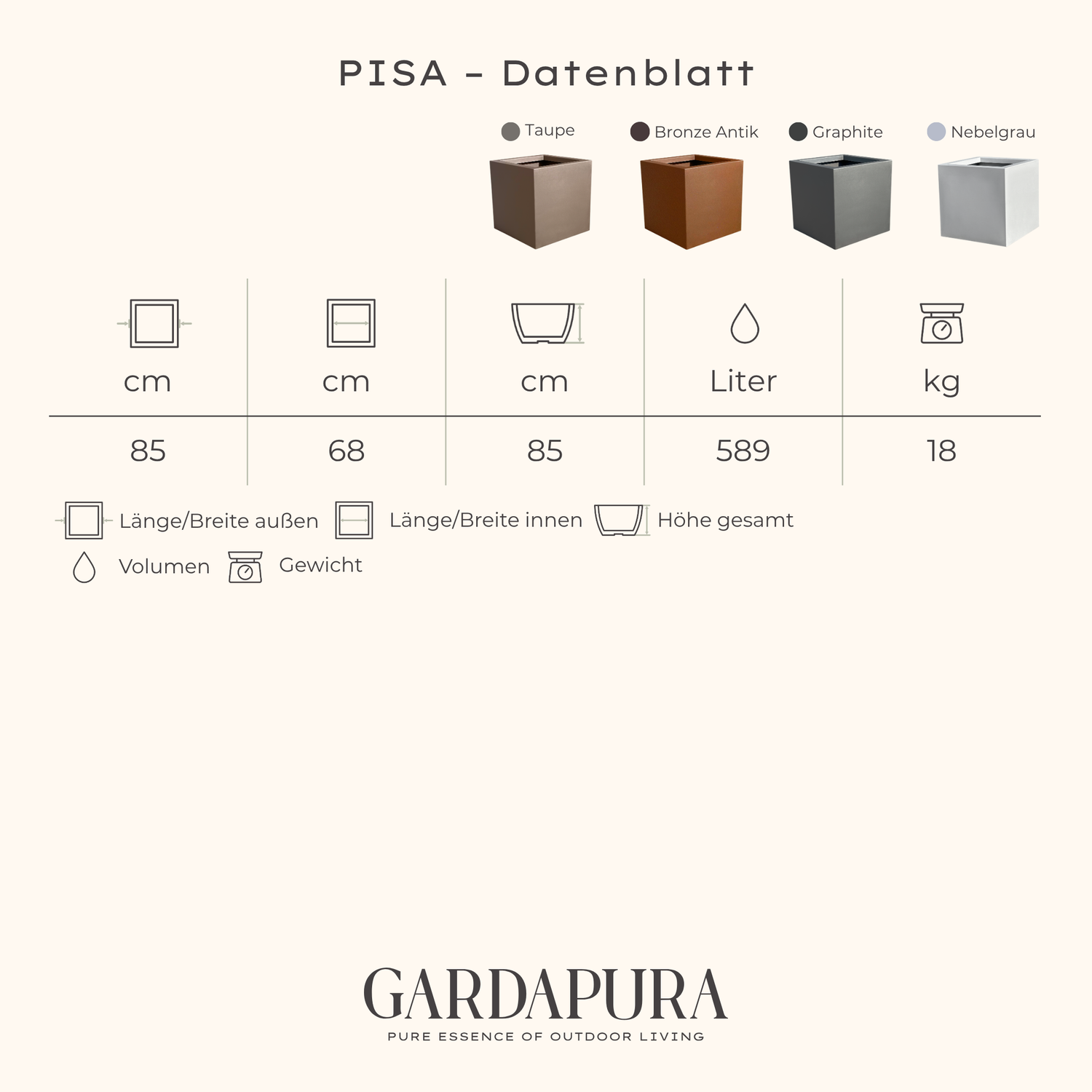 PISA ergänzt sich perfekt mit dem Atlas Square aus der Toskana Collection und stellt eine moderne Alternative dar, die sich durch seine seltene Größe von anderen Pflanzgefäßen abhebt. Der robuste Recycling-Kunststoff sorgt für Frostsicherheit, Stabilität und Langlebigkeit.