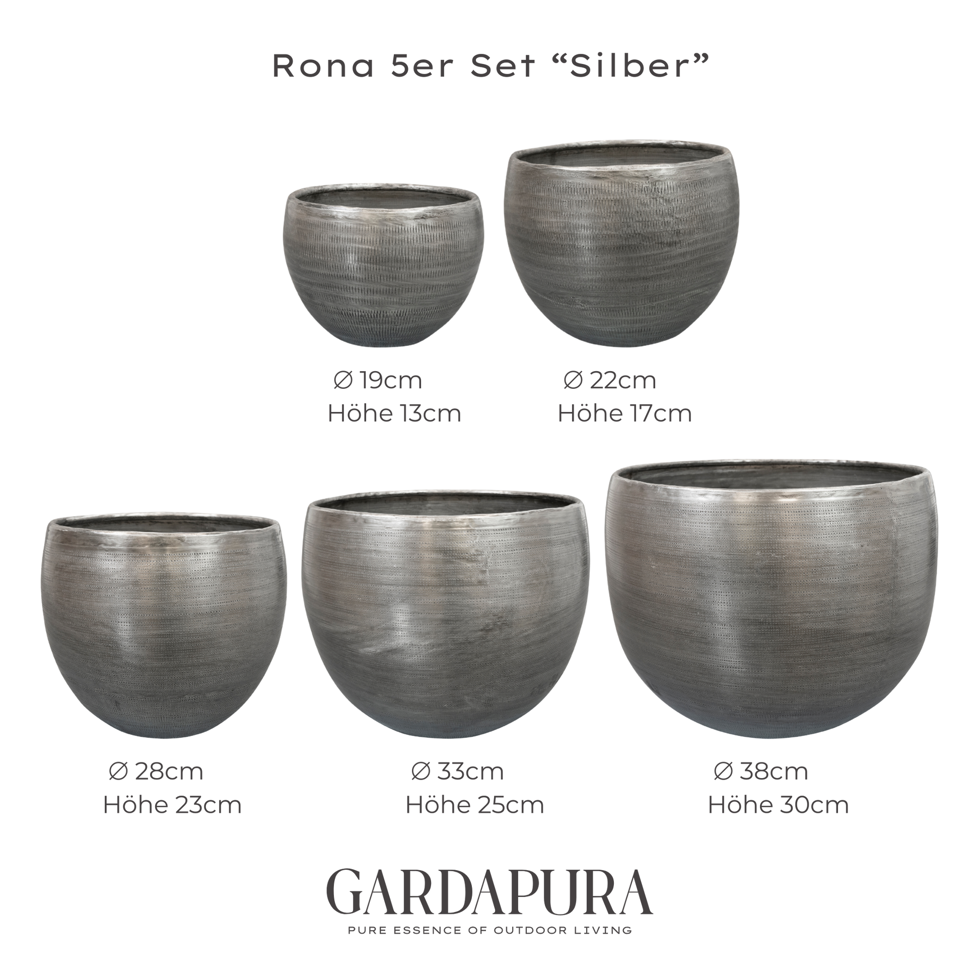 Fünf Größen, eine Designlinie – das Rona 5er-Set bietet Ihnen eine stilvolle Kombination für kreative Pflanzarrangements. Die charakteristische, strukturierte Metalloberfläche verleiht jedem Topf eine faszinierende Tiefe und einen edlen Glanz. Dank der abgestuften Größen können Sie das Set flexibel einsetzen: als harmonische Gruppe oder einzeln arrangiert – drinnen wie draußen.
