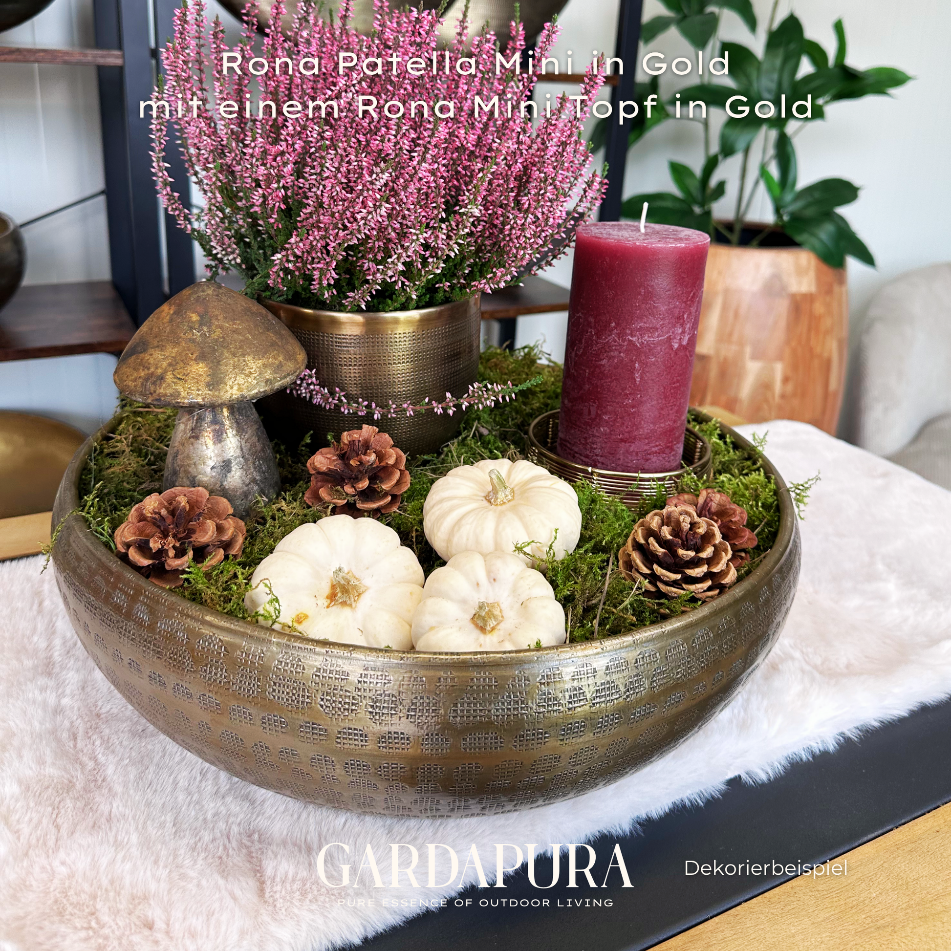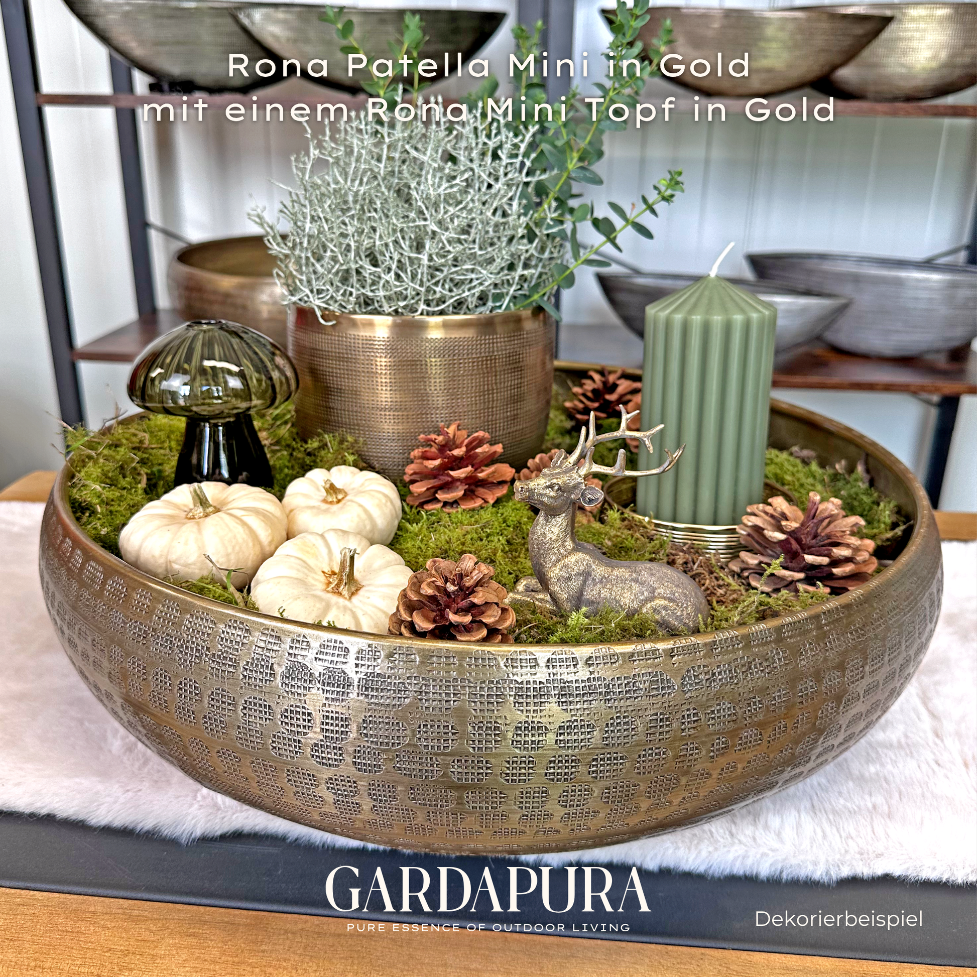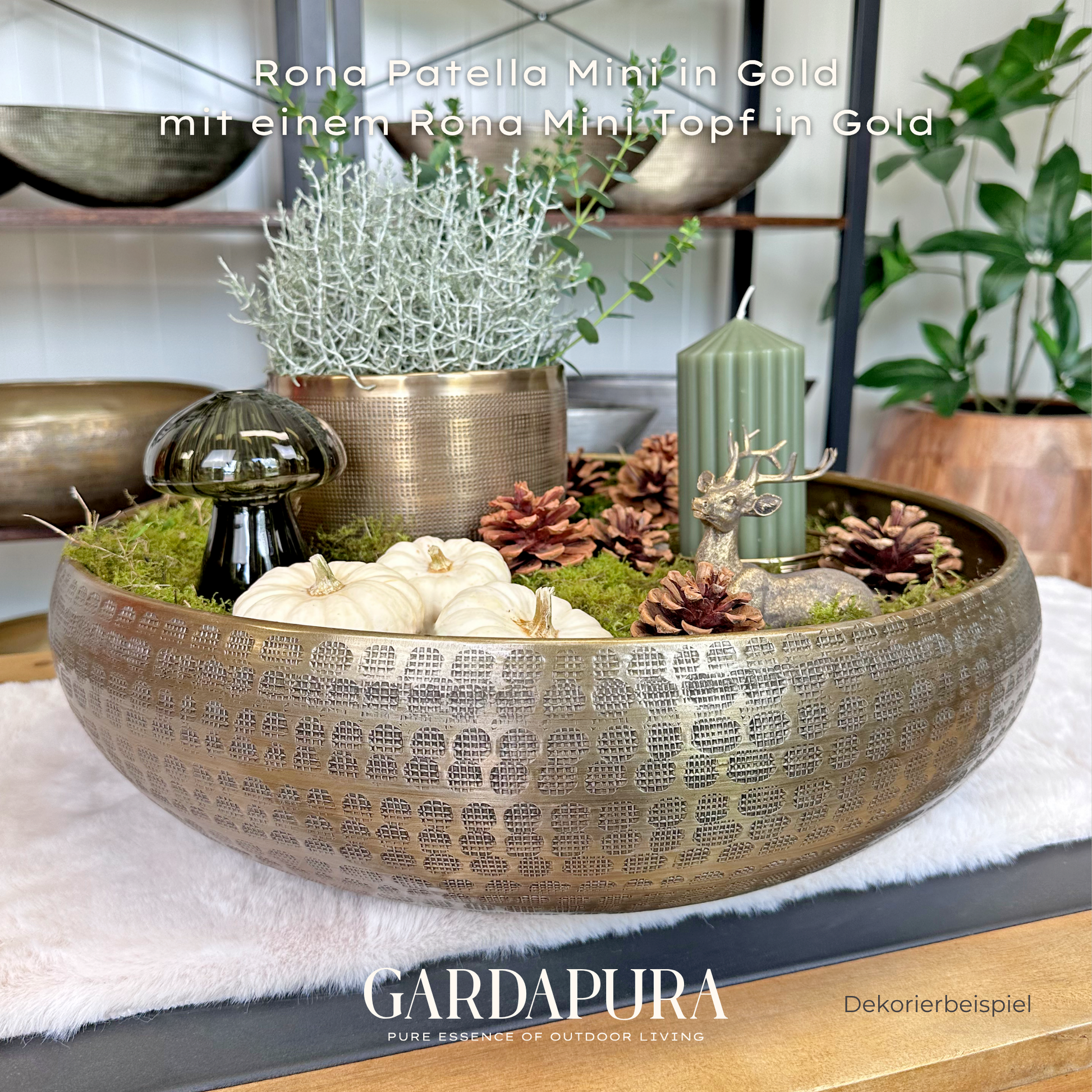 Die Patella Mini ist in den eleganten Farbtönen Gold, Silber und Grüngold erhältlich und macht sowohl auf Tischen als auch auf Kommoden oder in Empfangsbereichen eine ausgezeichnete Figur. Da auch hier kein Drainageverschluss vorhanden ist, ist sie speziell für den Indoor-Bereich gedacht.