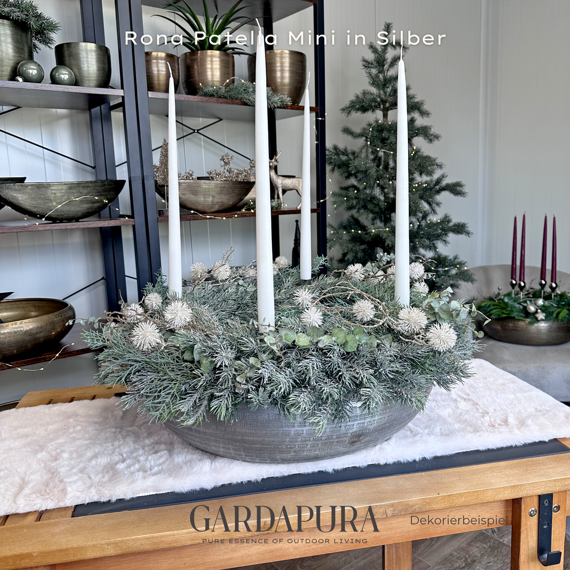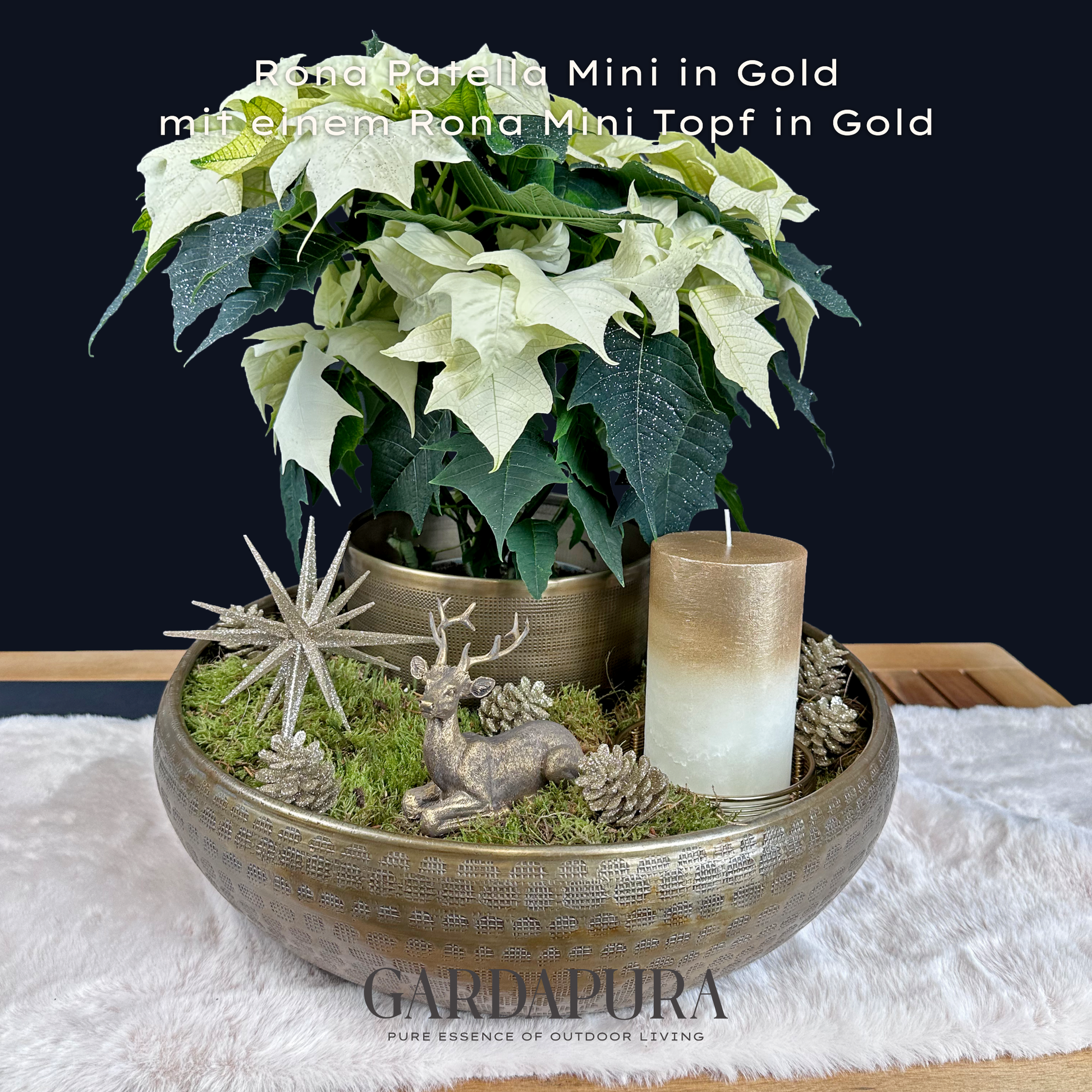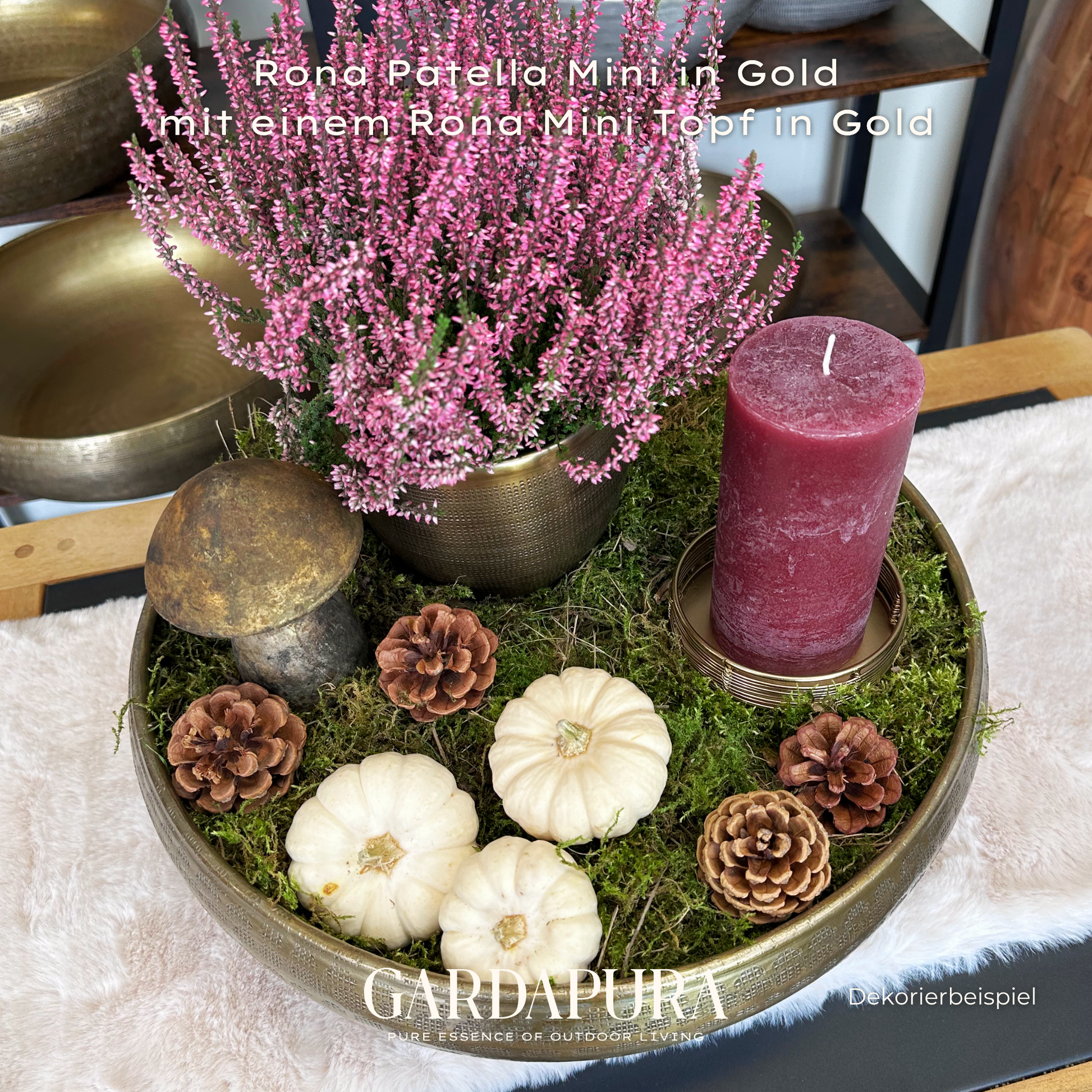 Die Patella Mini ist in den eleganten Farbtönen Gold, Silber und Grüngold erhältlich und macht sowohl auf Tischen als auch auf Kommoden oder in Empfangsbereichen eine ausgezeichnete Figur. Da auch hier kein Drainageverschluss vorhanden ist, ist sie speziell für den Indoor-Bereich gedacht.