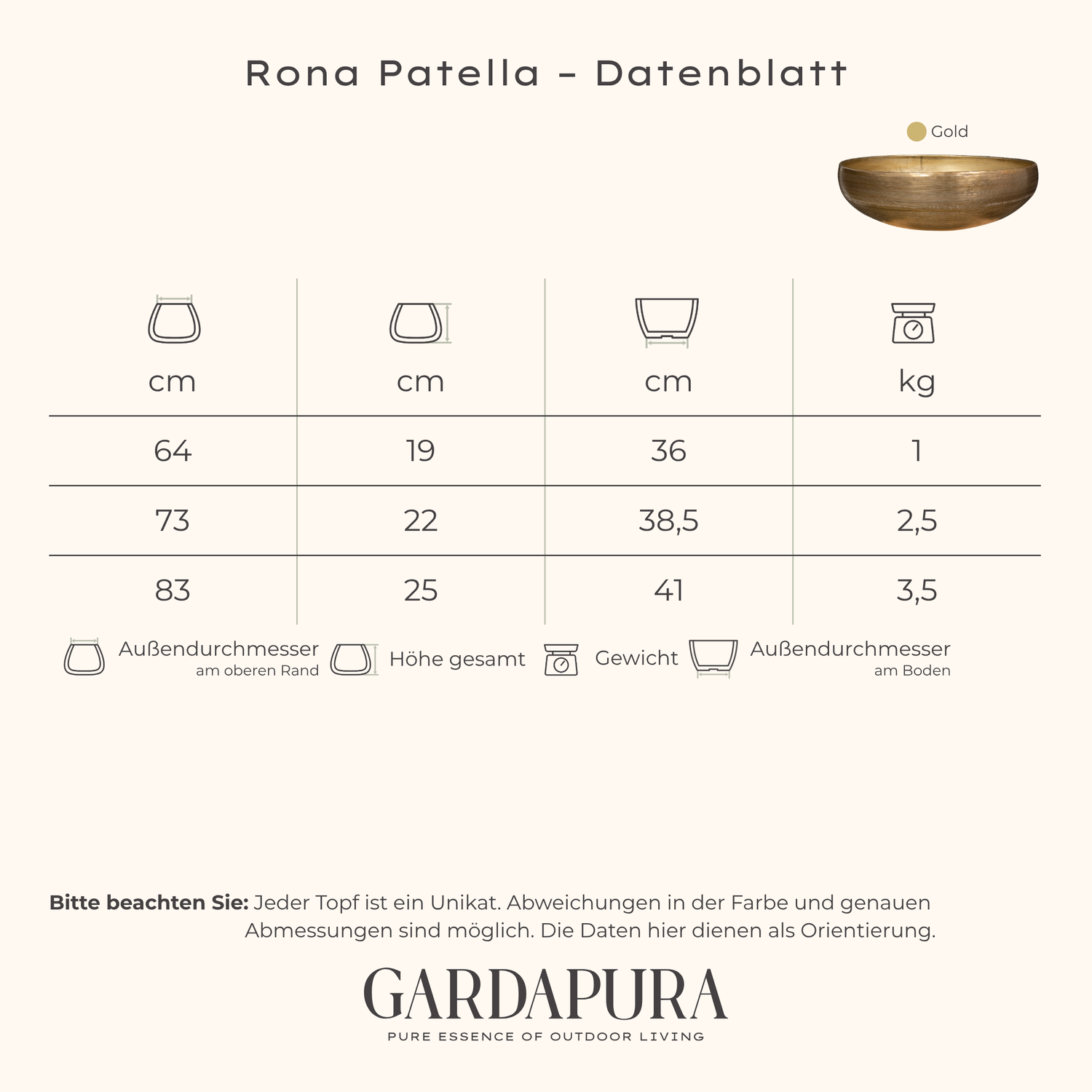 - Herausnehmbarer Drainageverschluss – Nutzen Sie Rona Patella als dekorative Schale im Innenbereich oder als direkt bepflanzbares Gefäß im Freien.